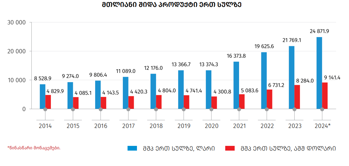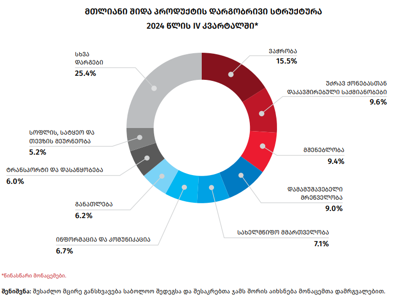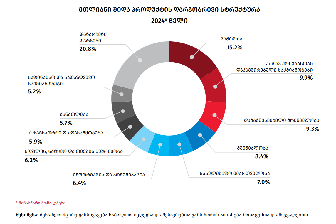 საქართველოს სტატისტიკის ეროვნული სამსახურის წინასწარი მონაცემებით, 2024 წელს რეალური შიდა პროდუქტი წინა წელთან შედარებით, 9.4%-ით გაიზარდა. მთლიანი შიდა პროდუქტის დეფლატორის პროცენტული ცვლილება 2024 წელს 3.8 პროცენტით განისაზღვრა. საქსტატის მონაცემებით, მთლიანი შიდა პროდუქტის დარგობრივ სტრუქტურაში ყველაზე დიდი წილით გამოირჩევა: