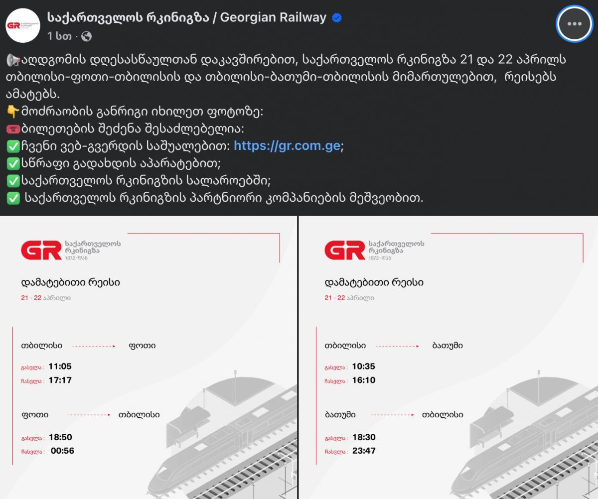 საქართველოს რკინიგზის განცხადებით, აღდგომის დღესასწაულთან დაკავშირებით, 21 და 22 აპრილს თბილისი-ფოთი-თბილისის და თბილისი-ბათუმი-თბილისის მიმართულებით, რეისებს ამატებენ.