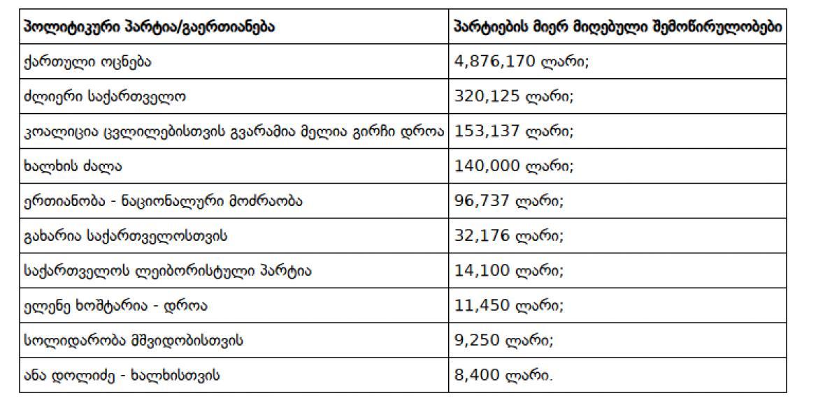 შემოწირულობების 86% „ქართულმა ოცნებამ“ მიიღო - რა თანხები შესწირეს წელს პარტიებს