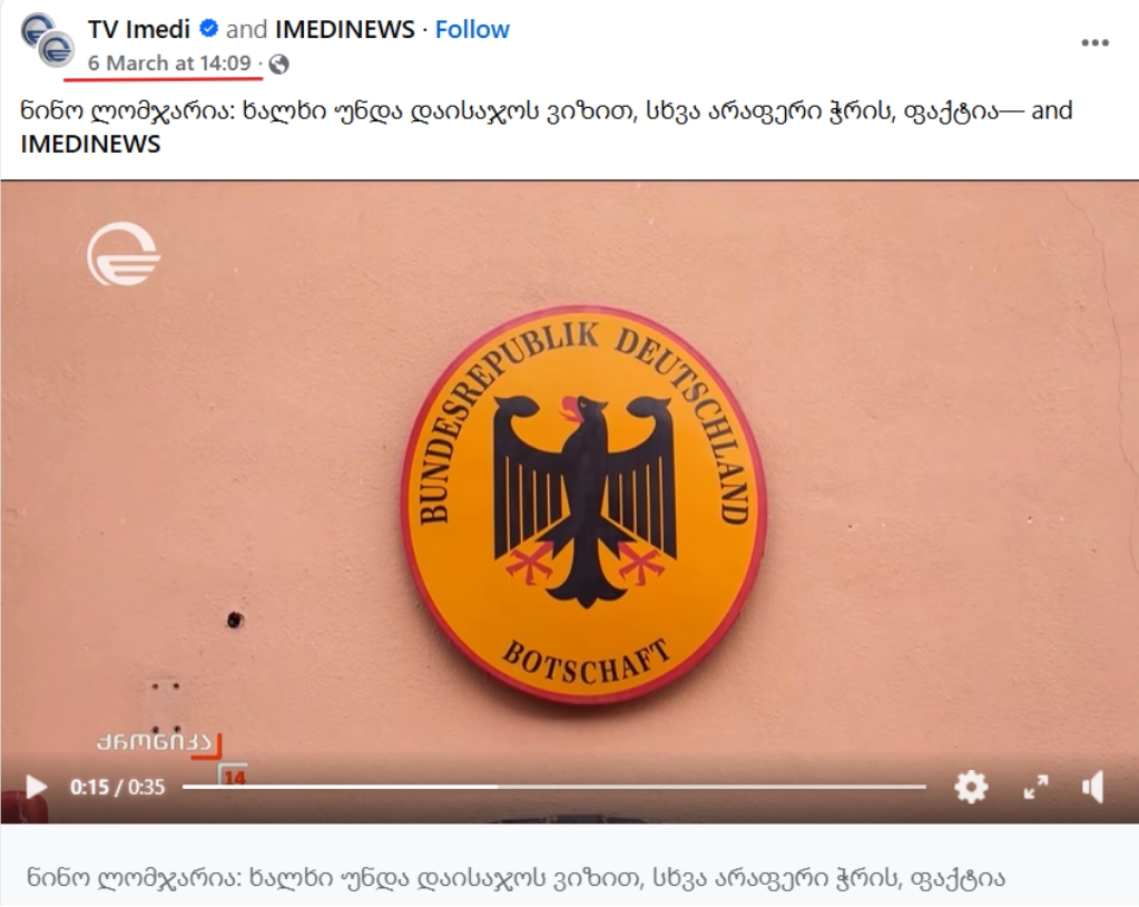 მითების დეტექტორის ახალი მასალის მიხედვით, სახელისუფლებო მედიები არა მხოლოდ ხელისუფლების პროპაგანდისტულ გზავნილებს ახმოვანებენ, არამედ ოცნების ოპონენტებისა და დამოუკიდებელი ინსტიტუტების დისკრედიტაციის პროცესში ხელისუფლებასთან მჭიდროდ თანამშრომლობენ. დეტექტორი წერს, რომ ამ თანამშრომლობის ფარგლებში მედიების მხრიდან ხშირად ისეთი კონფიდენციალური ინფორმაციები იჟონება, რომლებზე წვდომაც მხოლოდ სახელმწიფო ინსტიტუტებს შესაძლოა ჰქონდეთ და მათივე ინფორმაციით, ზოგ შემთხვევაში სამიზნე პირებზე თვალთვალის შედეგად შეიძლება იყოს მოპოვებული. სტატიაში განხილულია ბოლო წლების მანძილზე პროპაგანდისტული მედიებით გავრცელებული ისეთი შემთხვევები, რომლებიც ზემოთხსენებულ ტენდენციას ავლენს. გთავაზობთ მითების დეტექტორის სტატიას: ტელეკომპანია იმედი გერმანიის ელჩისა და "ევროპული ორბიტის" ლიდერის დახურული შეხვედრის შინაარსს მტკიცებულებების გარეშე აშუქებს 6 მარტს, 14:09 საათზე, ტელეკომპანია იმედმა გაავრცელა ინფორმაცია, რომლის მიხედვითაც გერმანიის საელჩოში “ევროპული ორბიტის” ლიდერს, ყოფილ სახალხო დამცველ ნინო ლომჯარიასა და გერმანიის ელჩ პიტერ ფიშერს შორის საელჩოს შენობაში დახურული შეხვედრა გაიმართა. იმედის მიერ გავრცელებულ ინფორმაციაში ნათქვამია, რომ ლომჯარიამ ელჩს შემდეგი სიტყვები უთხრა: „ხალხი უნდა დაისაჯოს ვიზით, სხვა არაფერი ჭრის, ფაქტია”. ტელევიზიის ინტერპრეტაციით, შეხვედრა საქართველოს მოქალაქეებისთვის ევროკავშირთან უვიზო მიმოსვლის შესაძლო შეზღუდვის საკითხს ეხებოდა, თუმცა მასალაში არ იყო მითითებული, თუ რა წყაროზე დაყრდნობით ავრცელებდა არხი ამ ინფორმაციას.