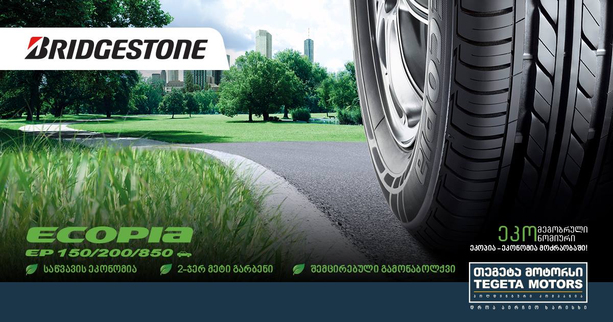 თეგეტა მომხარებელს Bridgestone-ს ბრენდის Ecopia-ს ზაფხულის საბურავებს სთავაზობს. Bridgestone Ecopia-ს საბურავები არის ახალი სტანდარტი საბურავების წარმოების სფეროში. პრემიუმ კლასის Ecopia-ს საბურავები გარდა იმისა, რომ არის ეკოლოგიურად უსაფრთხო მასალისგან დამზადებული, ის ორჯერ უფრო მეტხანს ემსახურება მოხმარებელს, არის მეტად გამძლე და მდგრადი. ასევე ახდენს საწვავის ეკონომიას და წარმატებით ართმევს თავს ყველაზე რთულ გარემო პირობებს. Bridgestone Ecopia-ს საბურავების გამოყენებით თქვენი გადაადგილება მეტად უსაფრთხო იქნება და ამასთანავე შეძლებთ საკმაოდ მნიშვნელოვანი დანაზოგის გაკეთებას. Bridgestone არის მსოფლიოს ერთ-ერთი წამყვანი საბურავების მწარმოებელი, რომელიც 1931 წელს დაარსდა იაპონიაში. კომპანია მისი მოღვაწეობის განმავლობაში ყოველთვის გამორჩეული იყო საბურავების წარმოებაში ინოვაციური მიდგომებით, თანამედროვე ტექნოლოგიებითა და მაღალი ხარისხით. Bridgestone-ს საბურავებით არაერთი სასახელო გამარჯვება მოიპოვეს ცნობილმა ავტო მრბოლელებმა. თეგეტა მოტორსი გახლავთ Bridgestone-ს ბრენდის ოფიციალური წარმომადგენელი საქართველოში, შესაბამისად Bridgestone-ს საბურავების ყველაზე დიდი არჩევანი სწორედ თეგეტას ფილიალებში დაგხვდებათ.