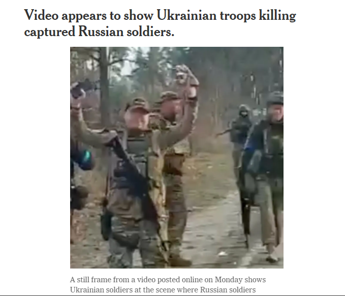 The New York Times-ი წერს, რომ მან მოახერხა ორშაბათს სოციალურ ქსელებში გაჩენილი ვიდეოს ავთენტურობის დადგენა, რომელშიც უკრაინელი სამხედროები დაჭრილ რუს სამხედროებს თავში დამიზნებით სროლებით ასრულებენ. ვიდეო გადაღებულია კიევის დასავლეთით მდებარე სოფელში, წერს NYT. როგორც ჩანს, ზოგიერთ მათგანს ხელები შეკრული აქვს. ახლოს არის ასევე BMD-2 ჯავშანმანქანა V სიმბოლოთი, ერთ-ერთი სიმბოლო იმისა, რასაც მოსკოვი "სპეციალურ ოპერაციას" უწოდებს. უკრაინის თავდაცვის სამინისტრომ ადრე ტვიტერში დაწერა ამ ადგილებში რუსული კოლონის განადგურების შესახებ. 30 მარტს უკრაინულმა სააგენტო UNIAN-მა გამოაქვეყნა ჩასაფრებული სვეტის განადგურების ვიდეო. გავრცელებული ინფორმაციით, ოპერაცია საქართველოდან მოხალისეებისგან შემდგარმა „ქართულმა ლეგიონმა“ განახორციელა.