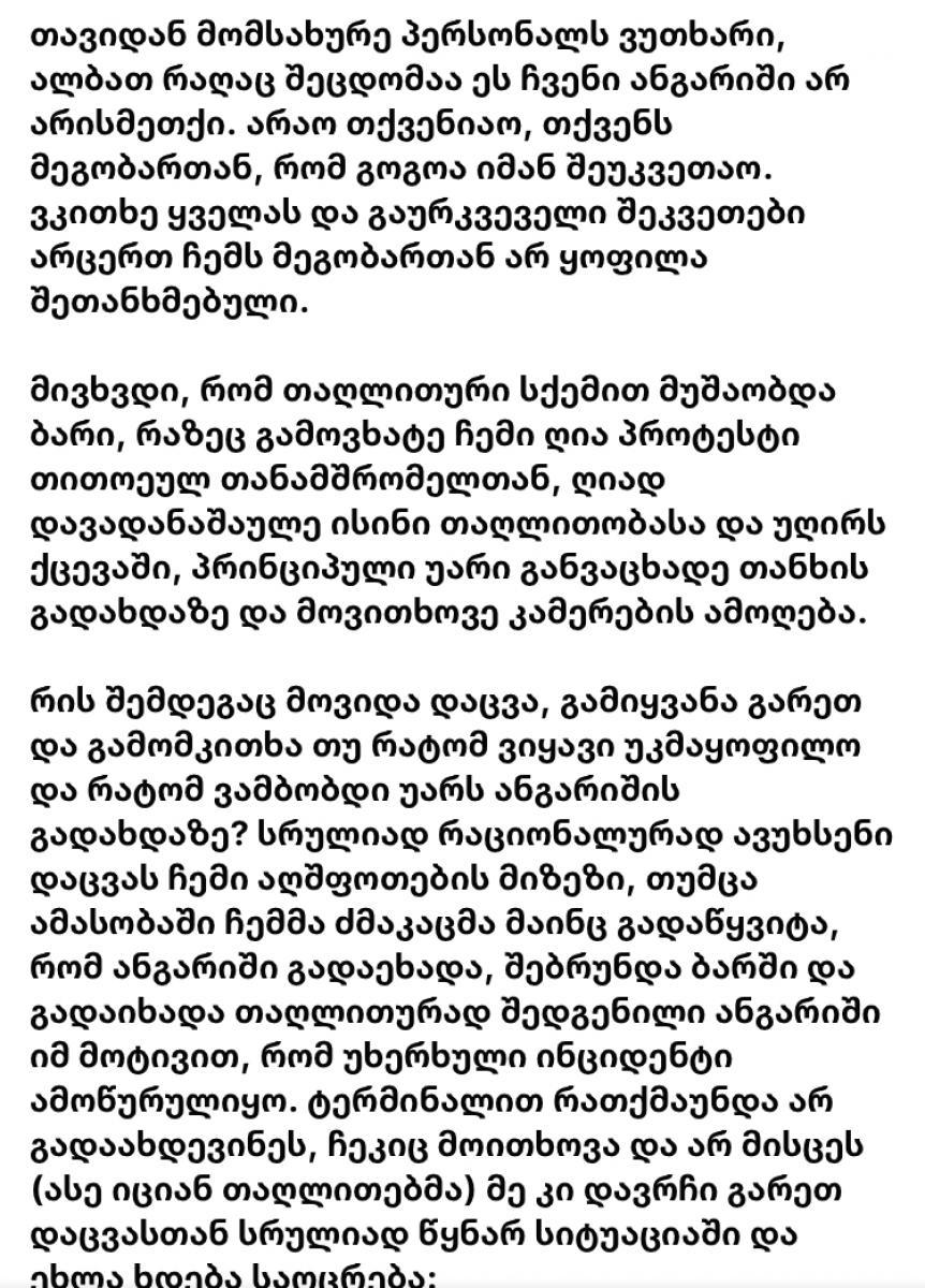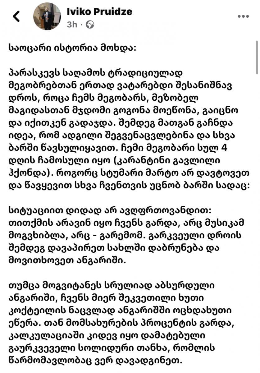 მოქალაქე, რომელმაც ერთ-ერთი კაფე-ბარი თაღლითობაში ამხილა, თანამშრომლებმა სცემეს ამის შესახებ ივიკო ფრუიძე თავის სოციალურ ქსელში წერს. როგორც დაზარალებული აღნიშნავს, მას და მის მეგობრებს ჯერ თაღლითური გზით ბარის თანამშრომლებმა ზედმეტი თანხის გადახდა აიძულეს, შემდეგ კი პრეტენზიის გამოთქმის გამო სცემეს. "პარასკევს საღამოს ტრადიციულად მეგობრებთან ერთად ვატარებდი შესანიშნავ დროს, როცა ჩემს მეგობარს, მეზობელ მაგიდასთან მჯდომი გოგონა მოეწონა, გაიცნო და იქითკენ გადაჯდა. შემდეგ მათგან გაჩნდა იდეა, რომ ადგილი შეგვენაცვლებინა და სხვა ბარში წავსულიყავით. ჩემი მეგობარი სულ 4 დღის ჩამოსული იყო (კარანტინი გავლილი ჰქონდა). როგორც სტუმარი მარტო არ დავტოვეთ და წავყევით სხვა ჩვენთვის უცნობ ბარში სადაც: სიტუაციით დიდად არ ავღფრთოვანდით: თითქმის არავინ იყო ჩვენს გარდა, არც მუსიკამ მოგვხიბლა, არც - გარემომ. გარკვეული დროის შემდეგ დავაპირეთ სახლში დაბრუნება და მოვითხოვეთ ანგარიში. თუმცა მოგვიტანეს სრულიად აბსურდული ანგარიში, ჩვენს მიერ შეკვეთილი ხუთი კოქტეილის ნაცვლად ანგარიშში ოცხდახუთი ეწერა. თან მომსახურების პროცენტის გარდა, კალკულაციაში კიდევ იყო დამატებული გაურკვეველი სოლიდური თანხა, რომლის წარმომავლობაც ვერ დავადგინეთ. თავიდან მომსახურე პერსონალს ვუთხარი, ალბათ რაღაც შეცდომაა ეს ჩვენი ანგარიში არ არისმეთქი. არაო თქვენიაო, თქვენს მეგობართან, რომ გოგოა იმან შეუკვეთაო. ვკითხე ყველას და გაურკვეველი შეკვეთები არცერთ ჩემს მეგობართან არ ყოფილა შეთანხმებული. მივხვდი, რომ თაღლითური სქემით მუშაობდა ბარი, რაზეც გამოვხატე ჩემი ღია პროტესტი თითოეულ თანამშრომელთან, ღიად დავადანაშაულე ისინი თაღლითობასა და უღირს ქცევაში, პრინციპული უარი განვაცხადე თანხის გადახდაზე და მოვითხოვე კამერების ამოღება. რის შემდეგაც მოვიდა დაცვა, გამიყვანა გარეთ და გამომკითხა თუ რატომ ვიყავი უკმაყოფილო და რატომ ვამბობდი უარს ანგარიშის გადახდაზე? სრულიად რაციონალურად ავუხსენი დაცვას ჩემი აღშფოთების მიზეზი, თუმცა ამასობაში ჩემმა ძმაკაცმა მაინც გადაწყვიტა, რომ ანგარიში გადაეხადა, შებრუნდა ბარში და გადაიხადა თაღლითურად შედგენილი ანგარიში იმ მოტივით, რომ უხერხული ინციდენტი ამოწურულიყო. ტერმინალით რათქმაუნდა არ გადაახდევინეს, ჩეკიც მოითხოვა და არ მისცეს (ასე იციან თაღლითებმა) მე კი დავრჩი გარეთ დაცვასთან სრულიად წყნარ სიტუაციაში და ეხლა ხდება საოცრება: დაცვის ერთერთი წევრი მეუბნება, რომ ვითომ ჩემი ბარში შებრუნებული ძმაკაცი მეძახის. რის შემდეგაც შევდივა
