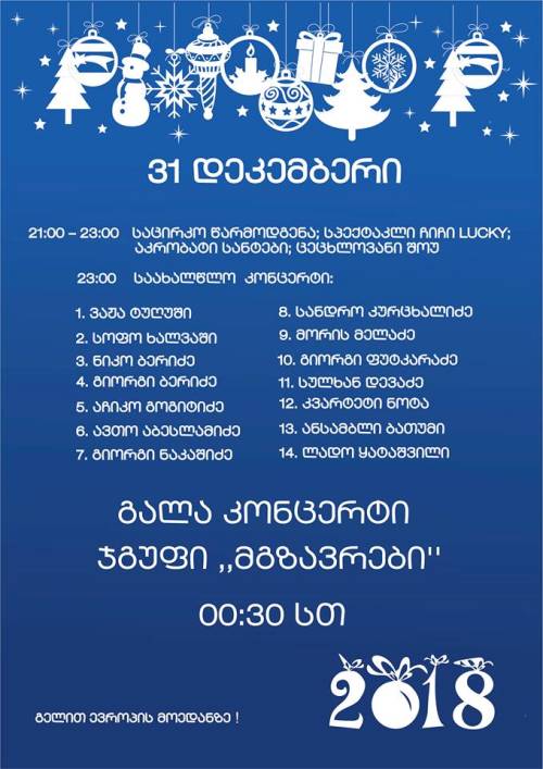 ბათუმში წინასაახალწლო ღონისძიებები გრძელდება. ღონისძიებებს ევროპის მოედანი მასპინძლობს. ხვალ, 29 დეკემბერს 12:00-დან 17:00 საათამდე საბავშვო-გასართობი კონცერტი გაიმართება. 18:00 საათზე წინასაახალწლო ღონისძიება გაიმართება ბათუმის ბულვარშიც. შესრულდება ქორეოგრაფიული და ვოკალური ნომრები, რომელშიც მონაწილეობას მიიღებენ ბათუმელი შემსრულებლები, გიორგი ბერიძე, ირაკლი გოგიტიძე და ადგილობრივი ბენდები. კონცერტის პარალელურად, კოლონადებთან ინდივიდუალური ავტორების მიერ შესრულებული საახალწლო თემატიკის ხელნაკეთი ნივთების გამოფენა-გაყიდვა გაიმართება. დღის ბოლოს, ევროპის მოედანზე ნიაზ დიასამიძისა და 33ა-ს კონცერტი გაიმართება. ევროპის მოედანზე მთელი დღის განმავლობაში საბავშვო-გასართობი ღონისძიებები 30 დეკემბერსაც მოეწყობა. საღამოს 20:00 საათზე დაიწყება კონცერტი ბათუმელი ბენდების მონაწილეობით: ლურჯი იალქანი, Black sea, Scool Band და Geoplanet. განსაკუთრებით მრავალფეროვანია საახალწლო პროგრამა 31 დეკემბერს. 21:00 საათიდან ევროპის მოედანზე საცირკო წარმოდგენა აკრობატი სანტების მონაწილეობით მოეწყობა. 23:00 საათზე საახალწლო გალა-კონცერტი ვაჟა ტუღუშის, სოფო ხალვაშის, ნიკო ბერიძის, გიორგი ბერიძის, ანსამბლი „ბათუმის", სულხან დევაძის და ლადო ყატაშვილის მონაწილეობით დაიწყება. საახალწლო პროგრამა 00:30 სთ-ზე ჯგუფი „მგზავრების" კონცერტით გაგრძელდება. (NS)