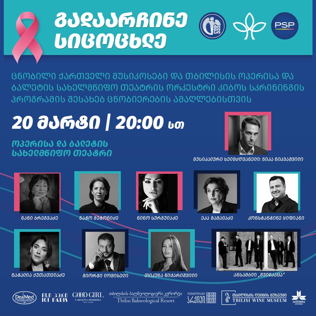 20 მარტს, 20:00 საათზე, თბილისის ოპერისა და ბალეტის სახელმწიფო თეატრში, ქალაქ თბილისის მუნიციპალიტეტის მერიის მხარდაჭერითა და დაფინანსებით, ცნობილი ქართველი მუსიკოსების მონაწილეობით კონცერტი გაიმართება. ღონისძიება, საქართველოში კიბოს სკრინინგის პროგრამის პოპულარიზაციის მიზნით, ეროვნული სკრინინგ ცენტრის ინიციატივითა და ა(ა)იპ „ქართული მუსიკის ცენტრის“ მხარდაჭერით დაწყებული საინფორმაციო კამპანიის მნიშვნელოვანი კომპონენტია. კამპანიაში ჩართულნი არიან ცნობილი ქართველი მუსიკოსები და შემსრულებლები: ნანი ბრეგვაძე, ნიკა ნიკვაშვილი და თბილისის ოპერისა და ბალეტის სახელმწიფო თეატრის ორკესტრი, ნინო სურგულაძე, ნატო მეტონიძე, ეკა მამალაძე, ნატალია ქუთათელაძე, ანსამბლი „შვიდკაცა“, კონსტანტინე ყიფიანი, გიორგი ლომისელი და თიკუნა წიქარიშვილი. კონცერტზე, ცნობილი შემსრულებლები, გარდა პოპულარული ნაწარმოებების შესრულებისა, საზოგადოებას კიბოს სკრინინგის ჩატარებისაკენ მოუწოდებენ. საინფორმაციო კამპანიის მიზანია, სრულიად ახლებურად დაანახოს კიბოს სკრინინგის ჩატარების მნიშვნელობა საზოგადოებას, ერთნაირად ჩართოს ყველა სფეროს წარმომადგენელი, იქნება ეს სახელოვნებო სფერო, ბიზნესსექტორი თუ სხვა. ამასთან, სოციალური პასუხისმგებლობის ფარგლებში, თავისი წვლილი შეიტანოს სიმსივნური დაავადებების ადრეული დიაგნოსტიკის, პრევენციისა და სკრინინგული პროგრამების პოპულარიზაციის საქმეში. ღონისძიების წარმდგენია კომპანია PSP. მედია პარტნიორია „პალიტრა მედია ჰოლდინგი“. სპონსორები არიან: „დეამედი“, „ისი პარი“, GOOD GIRL Carolina Herrera, თბილისის ბალნეოლოგიური კურორტი, რესტორანი „არქივი“, თბილისის ღვინის მუზეუმი.