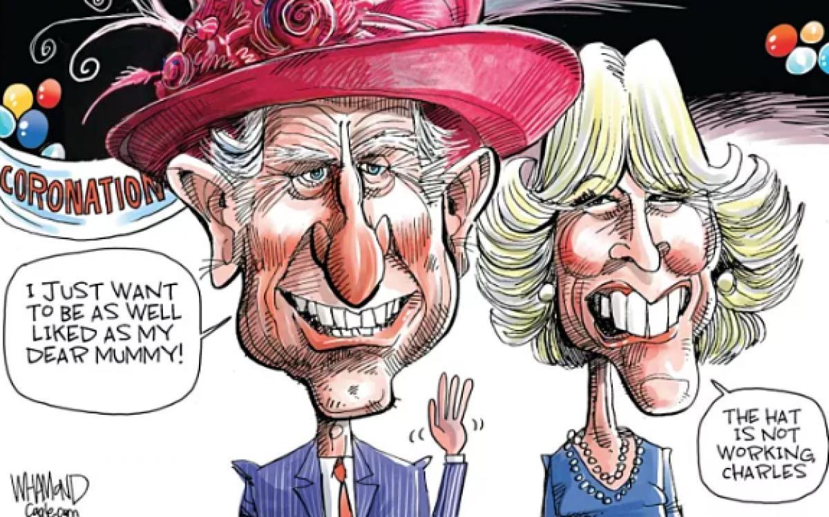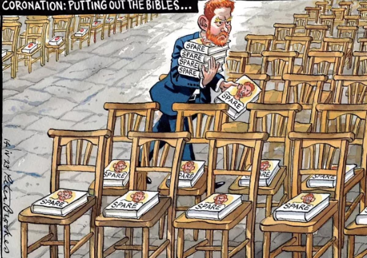 The Times-მა გამოაქვეყნა პიტერ ბრუკის მულტფილმი პრინც ჰარის შესახებ. გამოსახულებაში სასექსის ჰერცოგი, რომელიც, მიუხედავად ბოლო სკანდალებისა, მაინც დაესწრება მამის კორონაციას, ლოცვებისა და ფსალმუნების ტექსტების ნაცვლად ეკლესიაში აქვეყნებს თავის ავტობიოგრაფიას "სპარე". აღსანიშნავია, რომ სოციალური კვლევის ეროვნული ცენტრის ბოლოდროინდელმა გამოკითხვამ აჩვენა, რომ მონარქიის მხარდაჭერა ამჟამად ყველაზე დაბალია და მიუხედავად იმისა, რომ კამილის იმიჯი მნიშვნელოვნად გაუმჯობესდა წლების განმავლობაში, ბევრი მაინც თვლის, რომ ის არ იმსახურებს მას. სათაური.. ანტიმონარქისტული ჯგუფები სოციალურ ქსელებში აქტიურად ავრცელებენ ჰეშთეგს #NotMyKing.