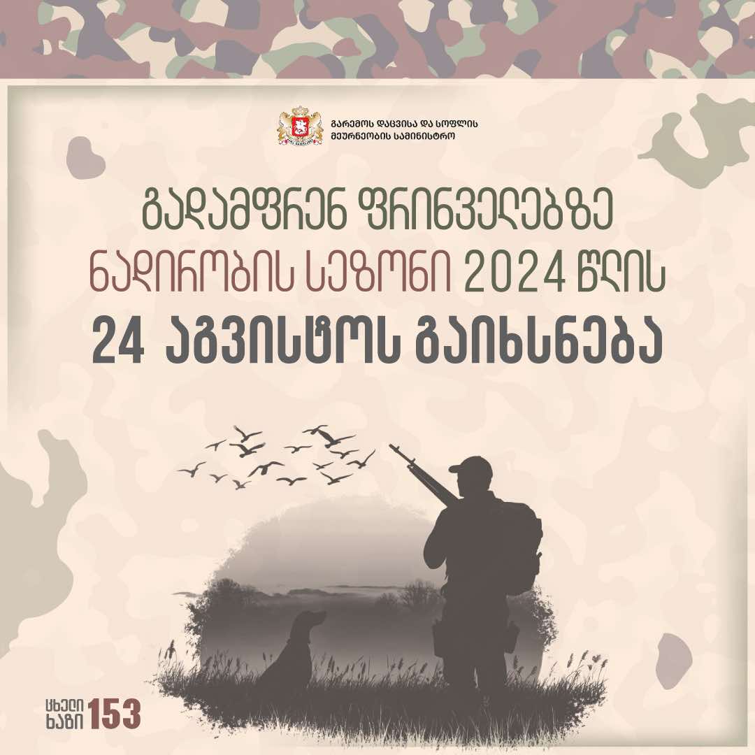 საქართველოს გარემოს დაცვისა და სოფლის მეურნეობის სამინისტრო "ცხოველთა სამყაროს ობიექტების, მათი სახეობების მიხედვით მოპყრობის წესების, ვადებისა და მოპოვებისთვის დაშვებული იარაღისა და მოწყობილობების ჩამონათვალის შესახებ დამტკიცების თაობაზე" ბრძანების შესაბამისად, ნადირობის სეზონს 2024 წლის აგვისტოს მეოთხე შაბათს (24 აგვისტო) გახსნის. ამის შესახებ ინფორმაციას გარემოს დაცვისა და სოფლის მეურნეობის სამინისტრო ავრცელებს. სამინისტროს ცნობით, გადამფრენ ფრინველებზე ნადირობის მსურველს ნადირობა გარემოდან გადამფრენი ფრინველების ამოღებაზე დაწესებული მოსაკრებლის (10 ლარი) გადახდის შემდეგ, აგვისტოს მეოთხე შაბათიდან მომდევნო წლის პირველ მარტამდე პერიოდში შეეძლება. "მოსაკრებლის გადახდა შესაძლებელია საქართველოს ნებისმიერ ბანკში, მიმღები ბანკი: სახელმწიფო ხაზინა, ბანკის კოდი: 220 101 222, ანგარიშის ნომერი: №200122900, ბიუჯეტის შემოსულობების სახის განმსაზღვრელი სახაზინო კოდი: 3033. გასათვალისწინებელია, რომ ნადირობა აკრძალულია საქართველოს კანონმდებლობით დადგენილ ადგილებში, მათ შორის: საქართველოს ქალაქების ადმინისტრაციულ საზღვრებში, სახელმწიფო ნაკრძალებში, ეროვნულ პარკებში, ნუგზარ ზაზანაშვილის სახელობის სამუხის მრავალმხრივი გამოყენების ტერიტორიაზე, ასევე სახელმწიფო ნაკრძალების გარშემო 500-მეტრიან და ეროვნული პარკების გარშემო 250-მეტრიან ზონებში; სამინისტროს სსიპ ველური ბუნების ეროვნული სააგენტოს მართვაში/სარგებლობაში არსებული საშენი მეურნეობების ფართობებზე. გადამფრენ ფრინველებზე ნადირობის მსურველმა ასევე უნდა გაითვალისწინოს, რომ ნადირობა აკრძალულია ყველა სხვა იარაღიდან, რომელიც მითითებული არ არის „იარაღის შესახებ“ საქართველოს კანონის მე-7 მუხლში, კერძოდ: სანადირო გლუვლულიანი ცეცხლსასროლი იარაღიდან (თოფი), სანადირო ხრახნილლულიანი ცეცხლსასროლი იარაღიდან (კარაბინი ან შაშხანა), სანადირო კომბინირებული ცეცხლსასროლი იარაღიდან (ხრახნილლულიანი და გლუვლულიანი თოფო), სანადირო ცივი და ცივი სასროლი იარაღიდან და სანადირო პნევმატური იარაღიდან. ნადირობისათვის დაშვებული გადამფრენი ფრინველების სახეობების ჩამონათვალი, ნადირობის ვადები და დღიური ლიმიტები ნადირობის ადგილების მიხედვით ვრცლად იხილეთ მითითებულ ბმულზე: https://mepa.gov.ge/Ge/PublicInformation/35115?fbclid=IwY2xjawEgOVhleHRuA2FlbQIxMAABHWd2NXDlblYOp57oaNCzii9ZbCBh_q9_sYj3CjylVb2a6-q9NLSgNLdkSw_aem_NM5oLTN7Z1E8evXl8qKD9w", - ნათქვამია სამინისტროს ინფორმაციაში.