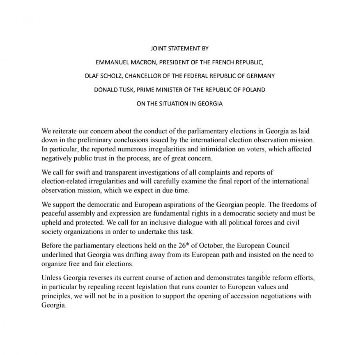 გერმანიის კანცლერი ოლაფ შოლცი, საფრანგეთის პრეზიდენტი ემანუელ მაკრონი და პოლონეთის პრემიერ-მინისტრი დონალდ ტუსკი ერთობლივ განცხადებას ავრცელებენ.