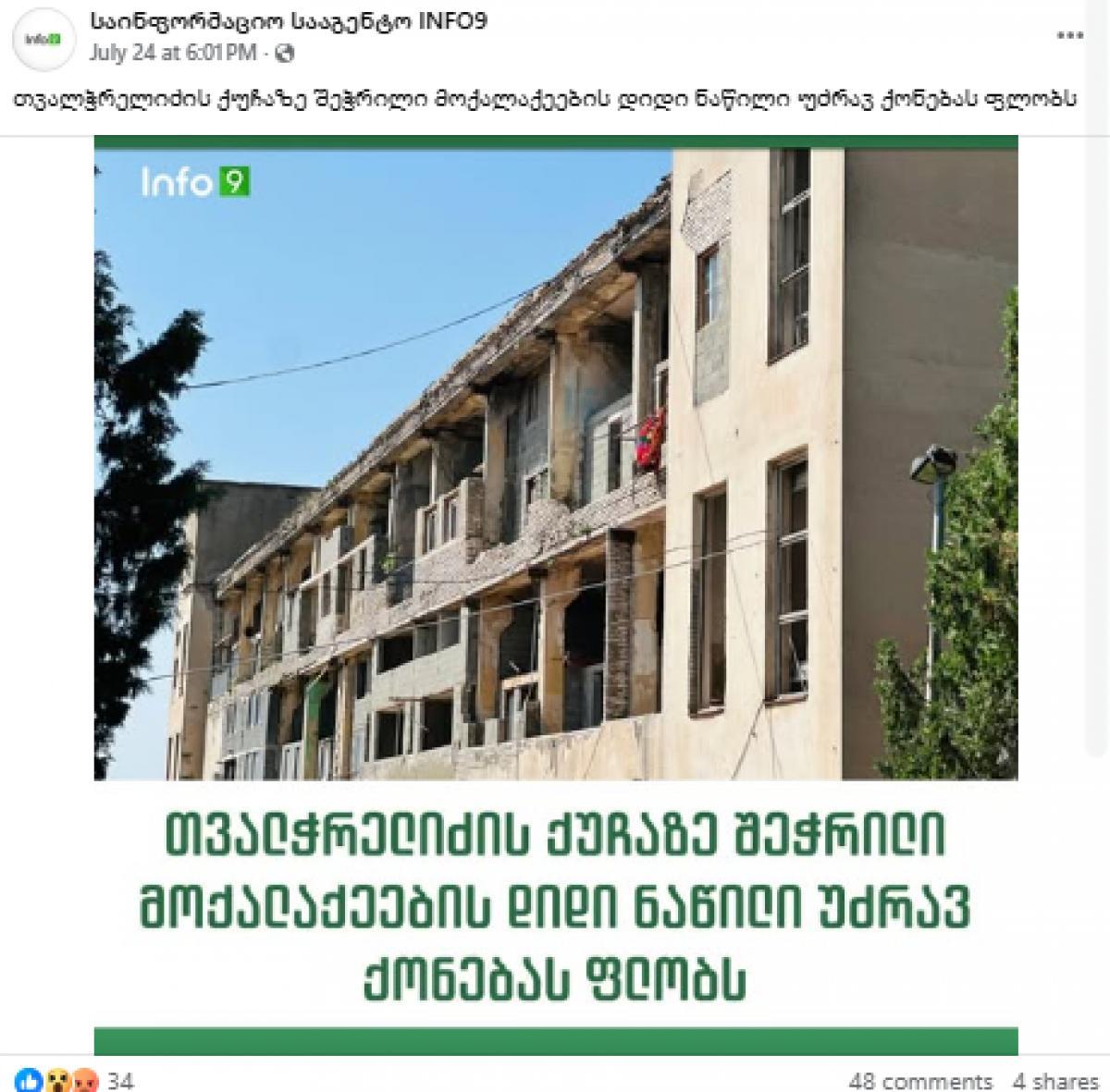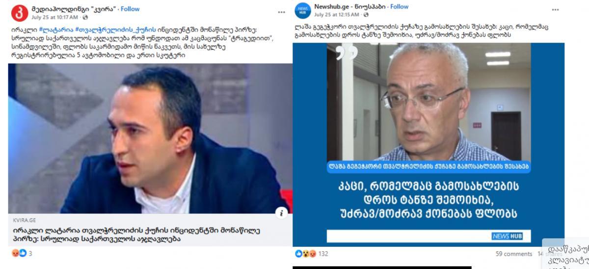 შემთხვევის შემდეგ ფეისბუქისა და ტიკტოკის პლატფორმებზე იმავე აქტორების მიერ კოორდინირებულად გავრცელდა ვიდეოც, რომელშიც ჩანდა, რომ შემთხვევის შემდეგ მოსახლეობა სახლის დატოვებაზე უარს ამბობდა.გამოსახლება თვალჭრელიძის ქუჩაზე 24 ივლისს აღსრულების ეროვნული ბიუროს წარმომადგენლებმა, პოლიციასთან ერთად, თვალჭრელიძის ქუჩაზე მცხოვრები მოქალაქეები ძალის გამოყენებით გამოასახლეს, იმავე ღამეს კი ადმინისტრაციული წესით 17 ადამიანი დააკავეს. გამოსახლების პარალელურად, „ქართული ოცნების“ ეკოსისტემის - პროპაგანდისტული მედიასაშუალებების, ანონიმური გვერდებისა ექსპერტებად პოზიციონირებადი პირების - მიერ გავრცელდა გამოსახლებული პირების მადისკრედიტირებელი პოსტები. იმისთვის, რომ გამოსახლების პროცესი საზოგადოების მხრიდან უფრო ნაკლებად მტკივნეულად აღქმულიყო, პოსტებში ხაზგასმული იყო მცხოვრებლების მატერიალური მდგომარეობა და მითითებული იყო, რომ ისინი უძრავ და სხვა ტიპის ქონებას ფლობდნენ. ამ საკითხზე პროპაგანდისტული მედიის ფეისბუქგვერდებზე კონკრეტული მოქალაქეების შესახებ საინფორმაციო ბარათები, ე.წ. ქარდები გავრცელდა. გამოსახლებულთა მატერიალურ მდგომარეობაზე აქცენტს აკეთებდნენ „ქართული ოცნების“ მხარდამჭერი ექსპერტებად პოზიციონირებადი პირებიც.
