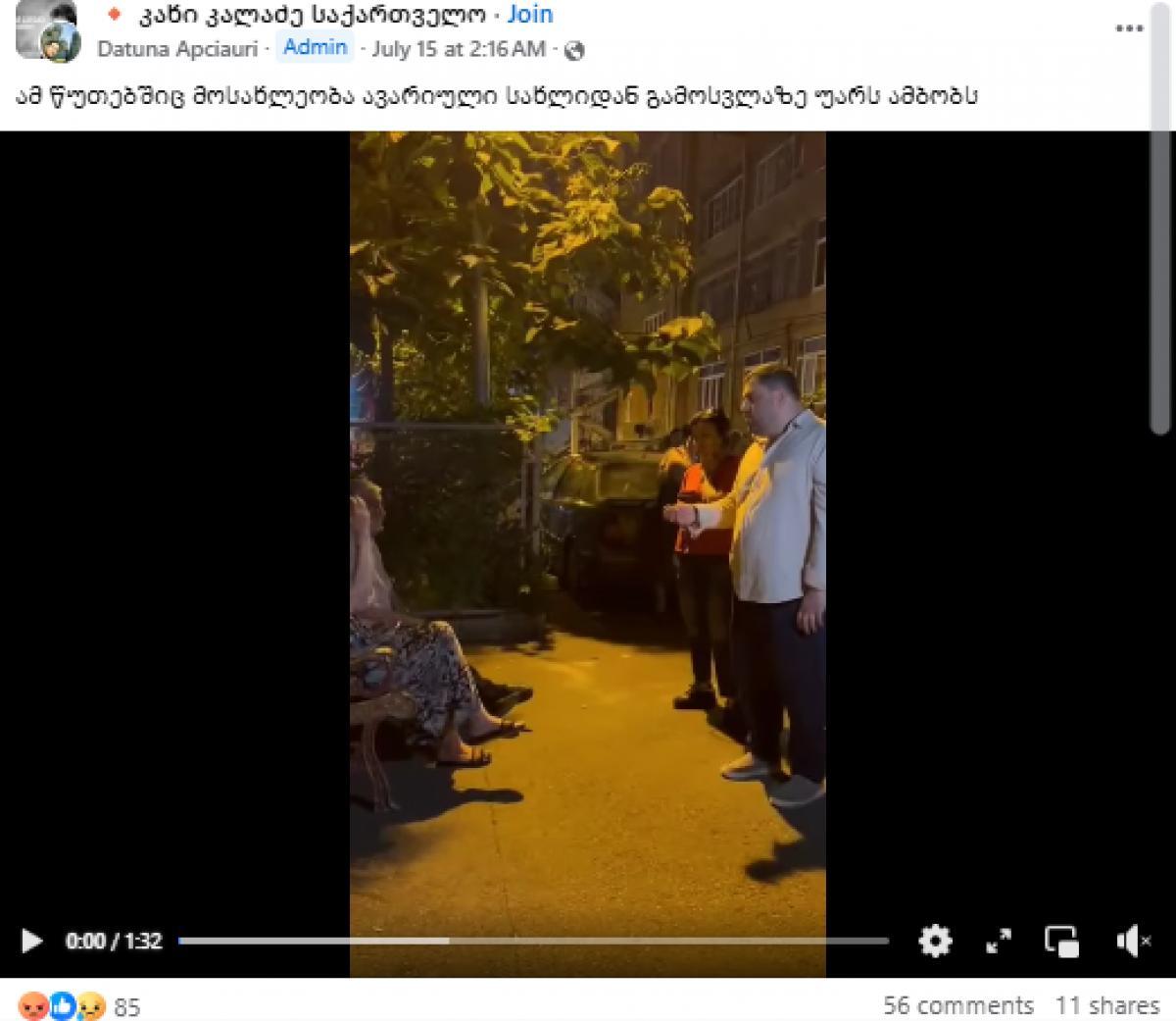 შენობის ფრაგმენტის ჩამონგრევა სადგურის მოედანზე 14 ივლისს სადგურის მოედანზე ავარიული საცხოვრებელი კორპუსის ფრაგმენტი მოწყდა, რასაც ორი ადამიანის სიცოცხლე ემსხვერპლა. მალევე ფეისბუქზე ერთ-ერთი მომხმარებლის მიერ გავრცელდა 2024 წლის მარტში გადაღებული ვიდეო, სადაც ჩანდა, რომ საცხოვრებელ კორპუსს ბზარი ჯერ კიდევ 1 წლის წინ ჰქონდა. ადგილობრივების თქმით, ბზარების შესახებ თბილისის მერიას რამდენიმეჯერ შეატყობინეს. შემთხვევიდან მალევე ადგილზე მივიდა ქალაქის მერი, კახა კალაძე, რომლის განცხადებითაც, შენობა ავარიული იყო და არ ექვემდებარებოდა რეაბილიტაციას, კორპუსის დემონტაჟს კი მოსახლეობის 100%-იანი თანხმობა სჭირდებოდა, რაც მერიას არ ჰქონდა. შემთხვევიდან მალევე „ქართული ოცნების“ წარმომადგენლებმა, მათთან დაკავშირებულმა პირებმა, გვერდებმა და მედიასაშუალებებმა დაიწყეს იმაზე აპელირება, რომ წარსულში მერია მოქალაქეებს ახალი სახლის აშენებას და ქირით უზრუნველყოფას სთავაზობდა, თუმცა ისინი თავად ამბობდნენ უარს ბინიდან გამოსვლაზე. მოქალაქეების პასუხისმგებლობის გამოსაკვეთად „ქართულ ოცნებასთან“ დაკავშირებული მედიასაშუალებები და ანგარიშები მათი განცხადებების ასლებს აქვეყნებდნენ, რომლებშიც ისინი ბინის დატოვებაზე უარს ამბობდნენ.