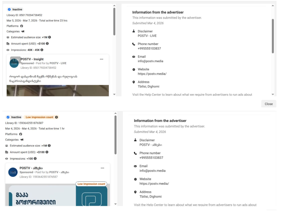 სამართლიანი არჩევნების განცხადებით, გამოავლინეს POSTV-ის 2 ახალი გვერდი, რომლებიც სანქციების დაწესების შემდეგ, 2026 წლის მარტში, შეიქმნა და ფეისბუქზე რეკლამებს ათავსებდა. ამ გვერდებმა პოლიტიკური რეკლამის განთავსების უფლება 4 მარტს მიიღეს და ყველა რეკლამა მომდევნო 2 დღის განმავლობაში გამოაქვეყნეს. ორგანიზაციის განცხადებით, აღსანიშნავია, რომ ორივე გვერდს რეკლამების ბიბლიოთეკის შენიშვნაში (ე.წ. დისქლეიმერში) იდენტური საკონტაქტო ინფორმაცია აქვს მითითებული.