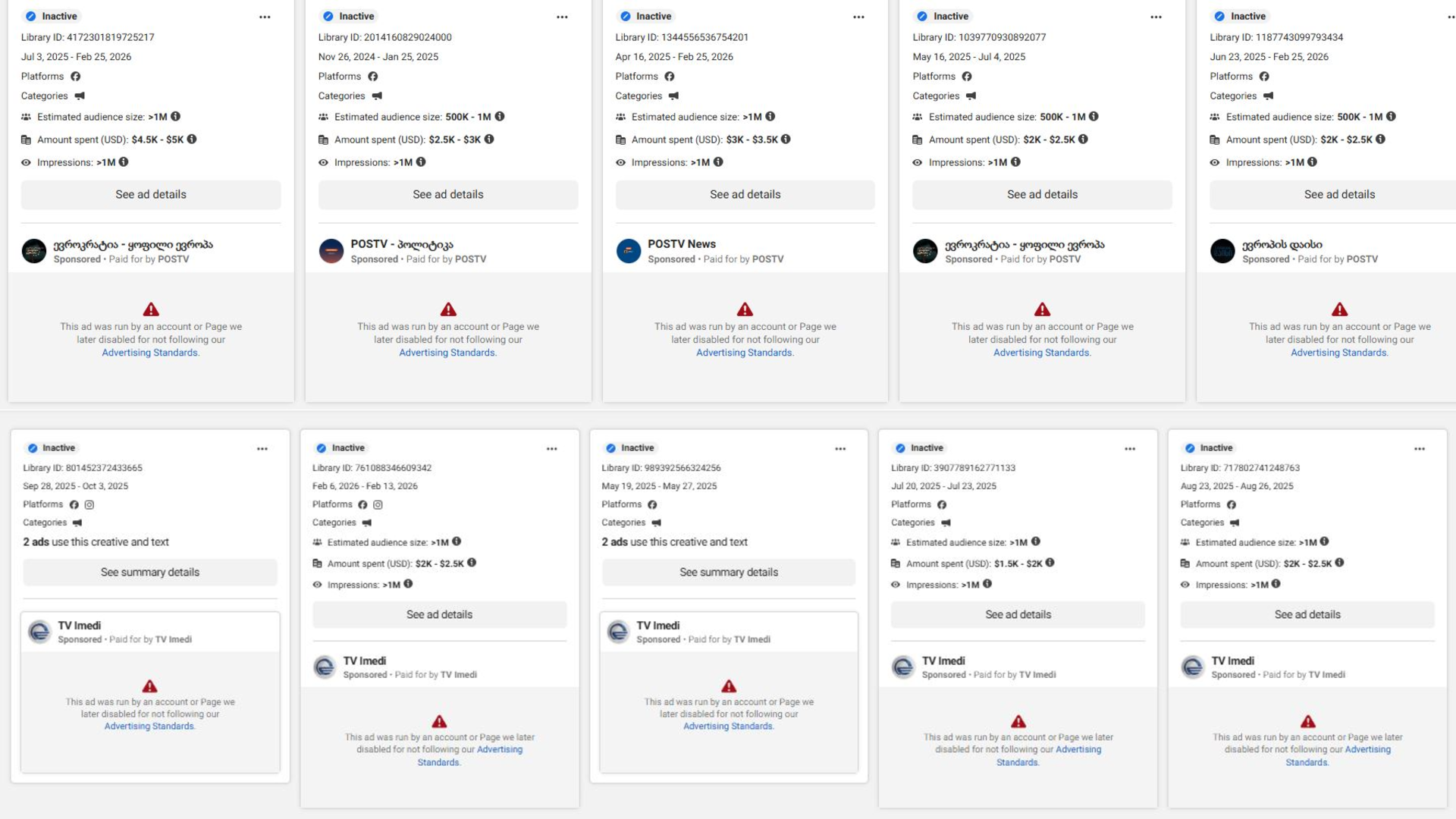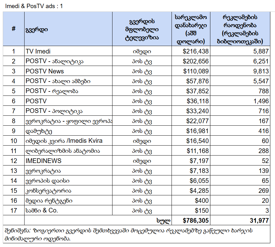 "აღსანიშნავია, რომ პროპაგანდისტული მედია ფეისბუქზე საქართველოს მასშტაბით რეკლამების ერთ-ერთი ყველაზე დიდი განმათავსებელი იყო. ბოლო მონაცემებით, 2026 წლის თებერვალში, „იმედმა“ და „პოს ტვ“-მ კუთვნილ გვერდებზე არასრულ ერთ თვეში 38 ათას აშშ დოლარამდე ღირებულების ათასამდე რეკლამა გამოაქვეყნეს. Meta-ს რეკლამების ბიბლიოთეკის მონაცემებით, რაც 2020 წლის აგვისტოდან 2026 წლის 25 თებერვლის ჩათვლით პერიოდს მოიცავს, ამ ორმა ტელეკომპანიამ, Meta-ს რეკლამებისთვის, სხვადასხვა გვერდის მეშვეობით, ჯამში არანაკლებ 786,305 აშშ დოლარი დახარჯა, რაც ქართული მედიასაშუალებებისთვის აბსოლუტურად რეკორდული მაჩვენებელია. ტელეკომპანიების „იმედისა“ და „პოს ტვ“-ის მიერ Meta-ს პლატფორმებზე განთავსებული პოლიტიკურ ან/და სოციალურ საკითხებთან დაკავშირებული რეკლამები 2020 წლის 4 აგვისტოდან 2026 წლის 25 თებერვლამდე" - წერს ISFED.